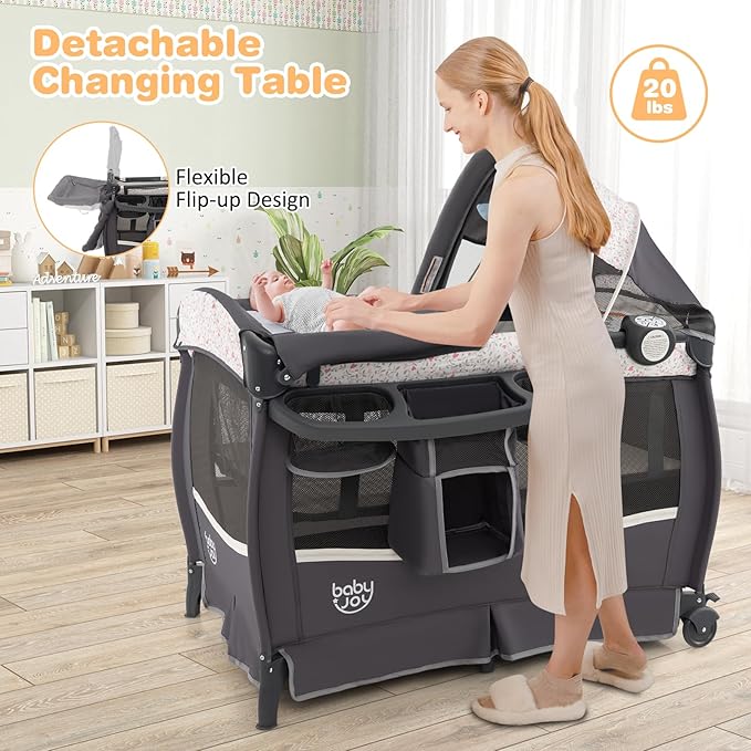 - 【All-in-one Pack and Play】 BABY JOY 4 in 1 pack and play accompanies the growth of your baby. The design of the flip-away diaper table allows mother to easily change diapers, and the comfortable playard provides a place for the baby to rest. In addition, the soft mattress offers comfortable lying experience(Suitable Mattress Pad's Size: 38''x26''). Morever, there is a large capacity storage basket and side storage bag to hold various baby necessities and keep them at reach.
