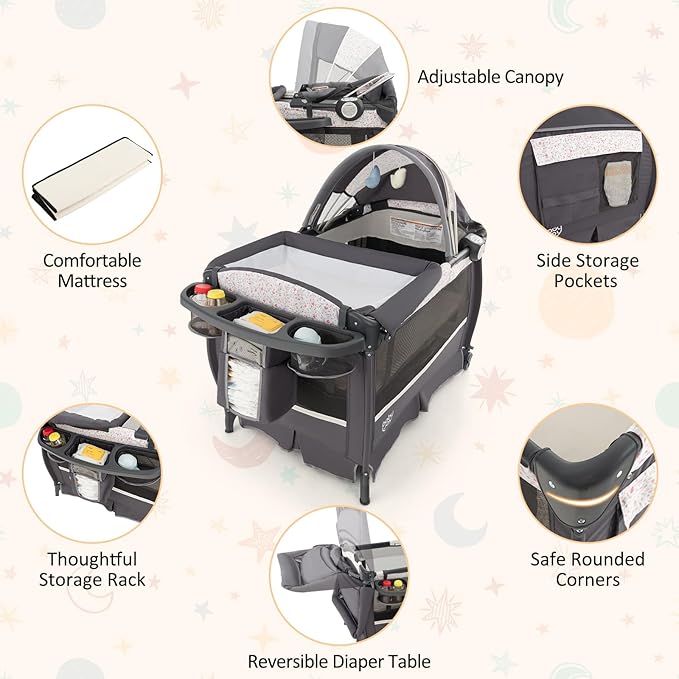 - 【Skin-Friendly Materials & Safe Details】 Our bed are made of breathable and skin-friendly fabrics, so babies can use them at ease. The removable & flip-away changing table provides a place for parents to change diapers or clothes for babies. 7-point supporting structure on the bottom comes with more steadiness. And the sturdy frame is made of iron tubes, which supports up to 33 lbs. Four round corners avoids bumping and scratching.