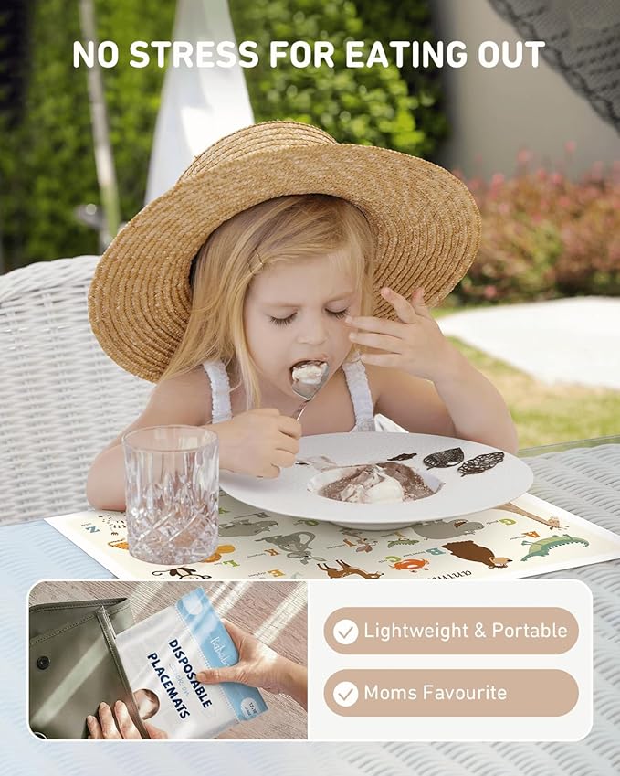 - No Stress for Eating Out: Our kids placemat disposable keeps baby from dirt, providing a sanitary surfaces for eating or playing. It is lightweight and portable, a must-have for home and on-the-go. The waterproof surface makes clean up easy