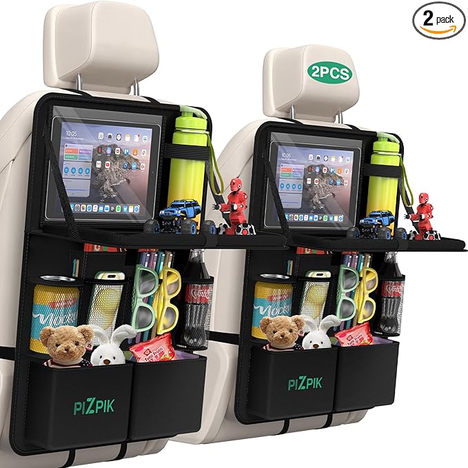 - 【PLENTY OF STORAGE SPACE】The backseat organizer has 11 pockets of different sizes and styles and comes with a foldable table stand, including clear tablet pocket, afabric pocket, pen pocket and durable mesh pocket, wonderful for storing a variety of items such as toys, snacks, bottles, tablets, mobile phones, sunglasses, books, pens and more