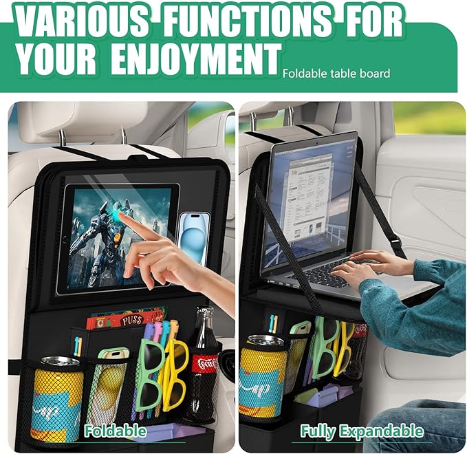 - 【PLENTY OF STORAGE SPACE】The backseat organizer has 11 pockets of different sizes and styles and comes with a foldable table stand, including clear tablet pocket, afabric pocket, pen pocket and durable mesh pocket, wonderful for storing a variety of items such as toys, snacks, bottles, tablets, mobile phones, sunglasses, books, pens and more