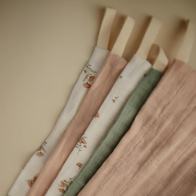 mushie Muslin Organic Cotton Washcloths 5-Pack (Pink Flowers Combo) | Soft Wipes for Baby Cleanups and Bathing