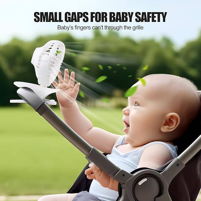 - 【360°Rotation & Baby friendly】360 degree vertical and horizontal adjustment, enjoying the cool air from any directions and keeping you cool all the time. Designed with small gaps, making it safe to use even for infants, protect the little inquisitive fingers from being hurt by the moving fan blade. We provide in-time and friendly customer service.