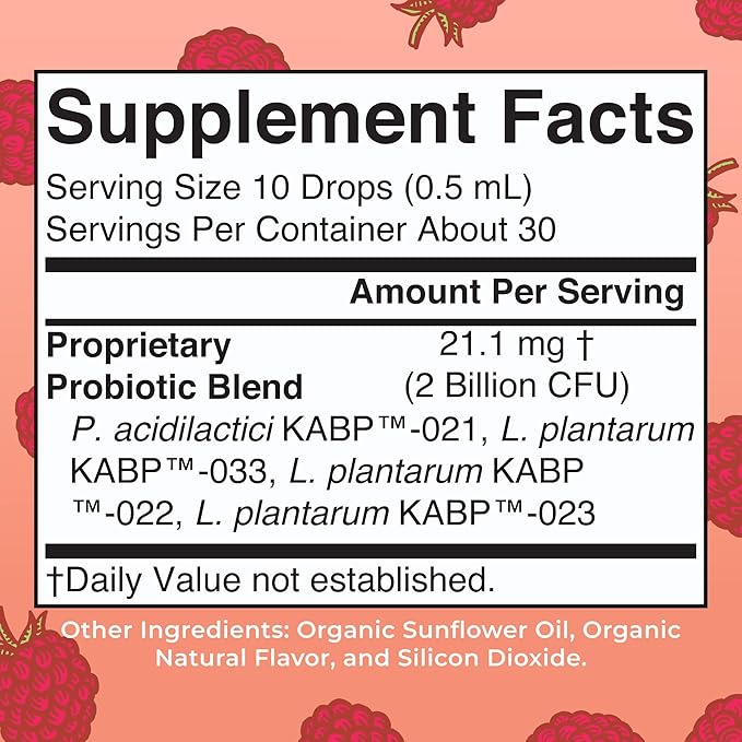 - Mary Ruth Probiotic Liquid Drops: Formulated with the probiotic strains P. acidilactici KABP-021, L. plantarum KABP-033, L. plantarum KABP-022, and L. plantarum KABP-023 for targeted support. These easy-to-take & delicious raspberry-flavored drops are a great incorporation into your daily routine!
