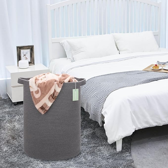 Large Cotton Rope Laundry Hamper 72L, Tall Baby Nursery Hamper, Woven Storage Basket for Living Room Bedroom, Laundry Basket for Storage Toys Clothes Towels, 16”x 22”, Dark Gray