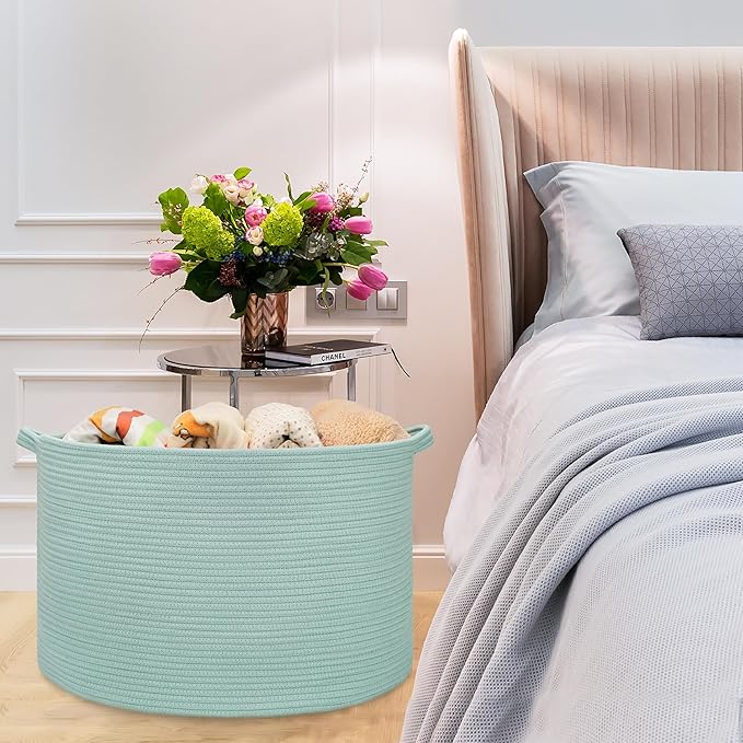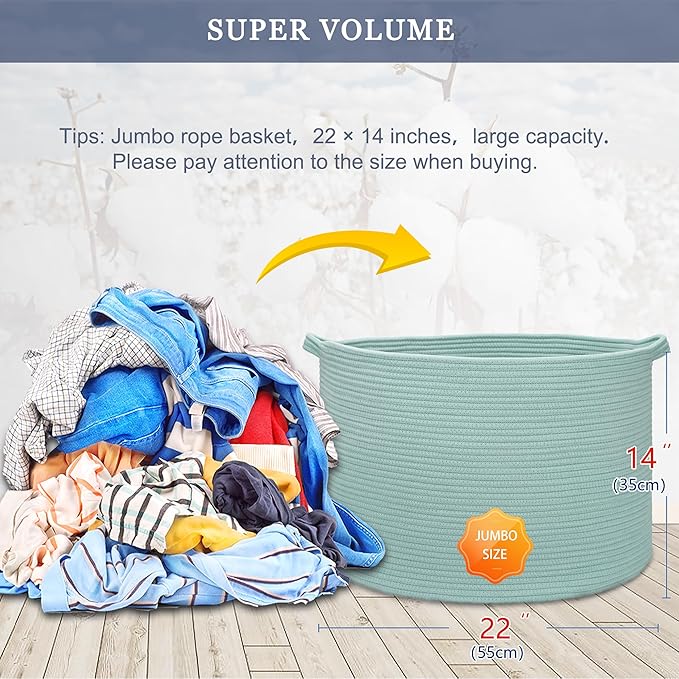 Extra Large Blanket Basket 87L, Laundry Hamper, Baby Nursery Hamper for Storage Toys Clothes Towels, Large Cotton Rope Laundry Basket for Girls Boys, 22”x 14”, Light Green