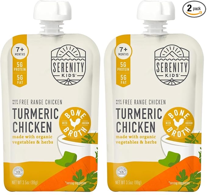 Serenity Kids Bone Broth Puree Made With Organic Veggies | Clean Label Project Purity Award Certified | 3.5 Ounce BPA-Free Pouch | Pasture Raised Turmeric Chicken | 1 Count (Pack of 2)