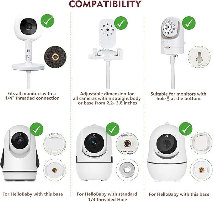 - 【UNIVERSAL FLOOR STAND】This baby monitor floor stand is compatible with Nanit Pro Smart Monitor & Flex Stand, Infant Optics DXR-8 Pro, HelloBaby, GoodBaby, Motorola, VAVA, Owlet, Baby Ganibs BG1049, Zulino Baby Monitor, Blemil BL9046 BL9052,OKAIDI OD8052 OD8051, Bonoch BBM01, BBM02, BBM03, BBM04, BBM05, BBM32, BBM34, And also fit other baby cameras with standard 1/4 threaded hole, providing a universal solution for your monitoring needs.