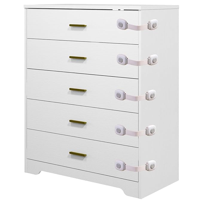 - Easy to Install Baby Safety Cabinet Locks: Strong adhesive industrial-grade tape on both sides of the child safety cabinet lock, No drilling screw or any special tools needed! so you can install and remove them within seconds, causing no damage, mar or remaining any marks on your furniture. and child safety strap locks are easy to use for adults but nearly impossible for a child to figure out - even if they can, they lack the finger strength to depress the buttons easily