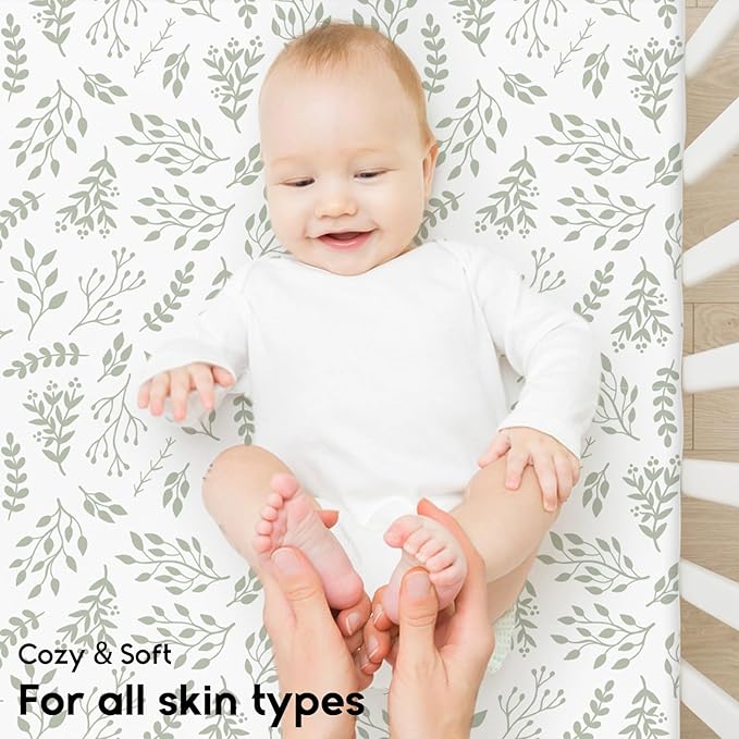 Yoofoss Pack and Play Sheets Fitted, Mini Crib Sheets 2-Pack for Pack N Play Mattress, Stretchy Playard Sheet, Soft and Breathable Green + Leaf
