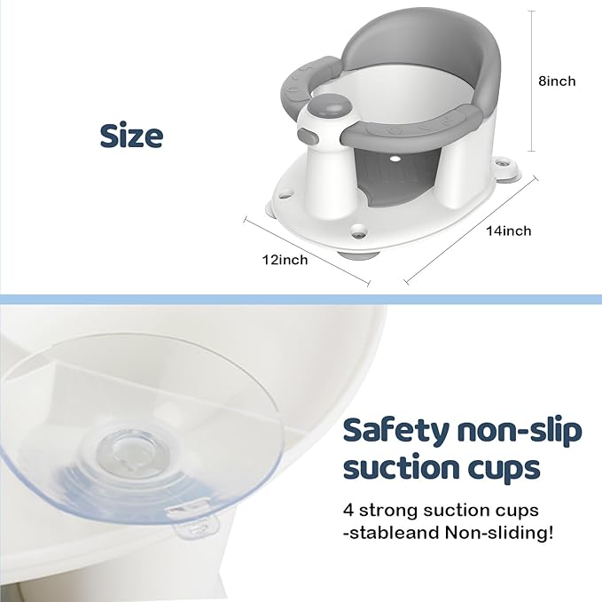 - âď¸ăComfortable and Secure with Strong Non-Slip Suction Cupă: This baby bath chair is designed to sit ergonomically and features a high back and armrests to provide a comfortable bathing experience for your baby. 4 ultra-strong non-slip suction cups ensure stability and securely attach to any smooth bathtub surface to ensure a safe bathing experience.