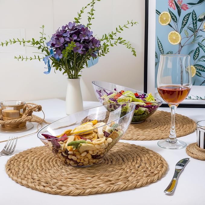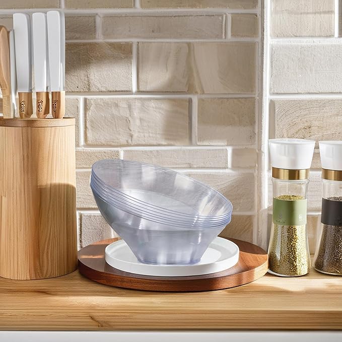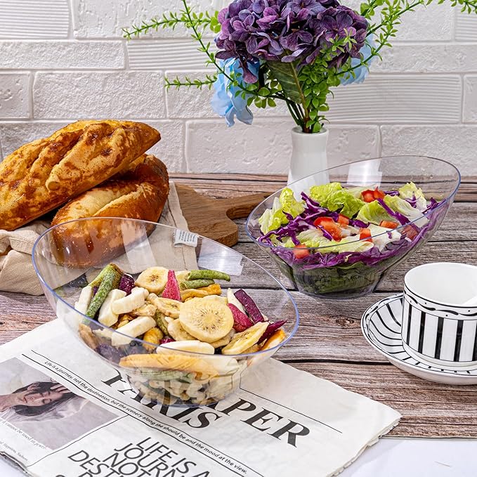- SPECIAL DESIGN:Our clear plastic bowl has a novel design concept that will definitely impress your users.Impress your friends when used as a plastic salad bowl.Slanted plastic bowls that can show your food more clearly.
