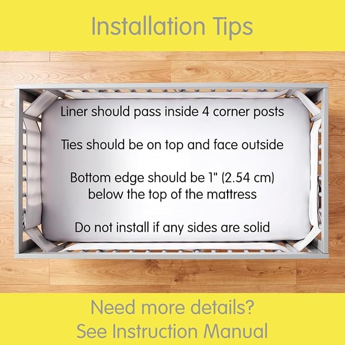 - EASY TO INSTALL: Liner should weave inside 4 corner posts and around interior of crib. Ties should be on top and face outside. Should not sag/appear loose. For help, see instruction manual and installation video or contact customer care for assistance.