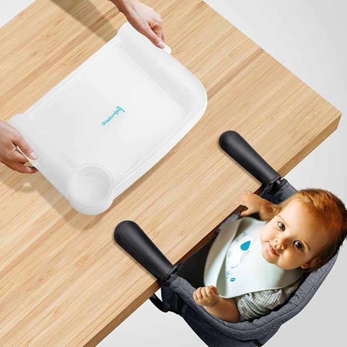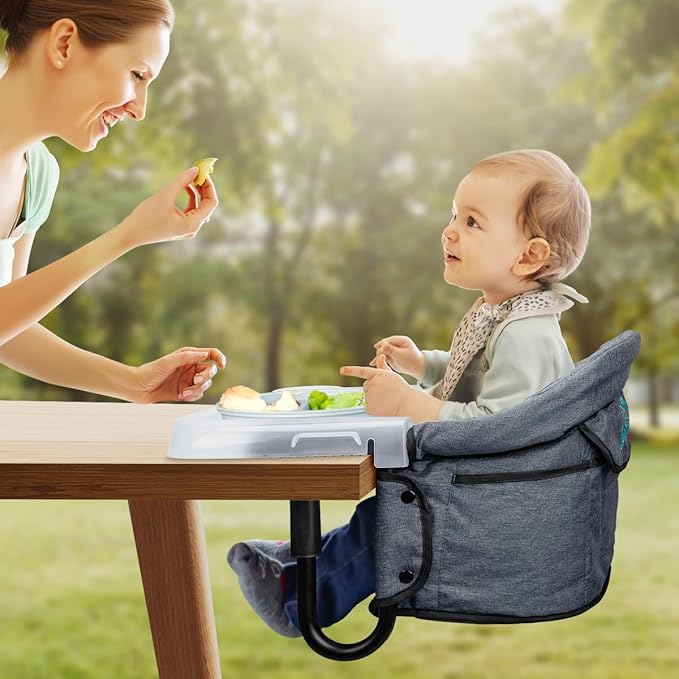 - 【Portable Hook-On Chairs with Tray】Our portable hook-on chairs is designed to be compatible with most types of tables ranging from 0.8 inches to 3.3 inches (20-85mm) in thickness,ensuring a secure fit on a wide variety of tabletop surfaces.It comes equipped with a convenient detachable feeding tray that attaches and detaches with ease,making mealtime a breeze for parents