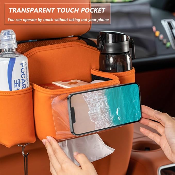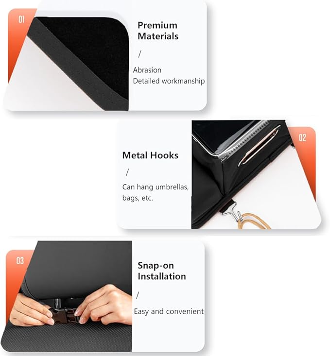 - 【LARGE STORAGE CAPACITY】:This car storage organizer has multiple pockets for mobile phones, wallets, toys, snacks, tissues, etc. There are also two hooks at the bottom to hang your umbrella, bag or garbage bag. It will make your car cleaner and neater.