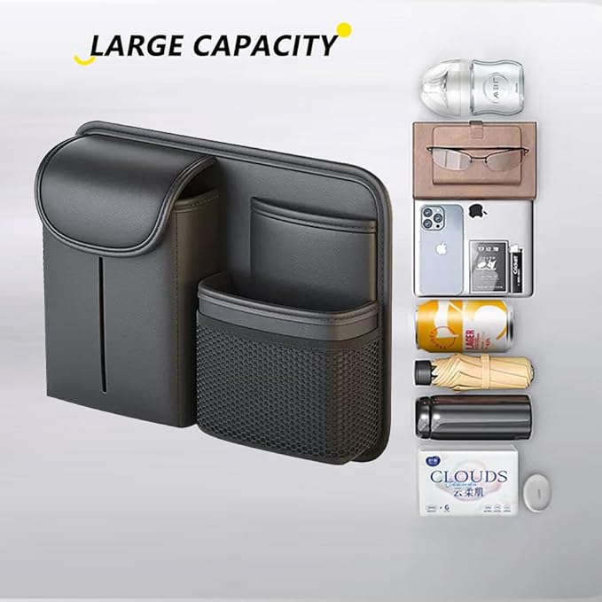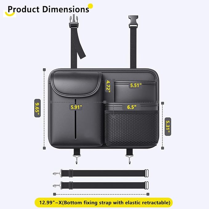 - 【LARGE STORAGE CAPACITY】:This car storage organizer has multiple pockets for mobile phones, wallets, toys, snacks, tissues, etc. There are also two hooks at the bottom to hang your umbrella, bag or garbage bag. It will make your car cleaner and neater.