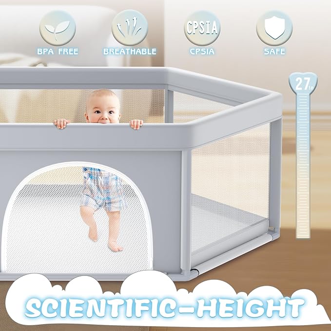 - FULL VISION DESIGN: In daily life, moms always have their own things to do, so they can't pay attention to their babies all the time, and this huge baby playpen can turn any place into a safe place to play. At the same time, baby can see you from any direction through the grid around the baby fence, giving mom peace of mind.