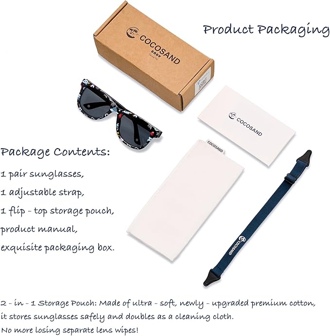 • 【Stylish and Practical Package】:COCOSAND baby sunglasses come with a flip - top glasses pouch and a product manual. The packaging is made of kraft paper, simple yet elegant