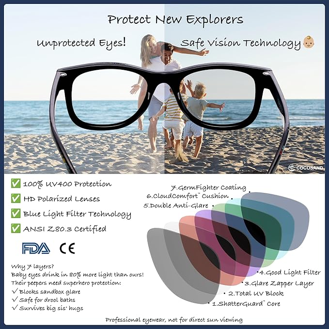 • 【Safety First for Your Baby】:COCOSAND baby sunglasses are a game - changer for 0 - 24 month olds. The polarized lenses protect eyes, and the TPE frame is as safe as can be. It's gentle on baby boys' and baby girls' skin, just like a soft hug. Whether they're infants or toddlers, it's a worry - free choice