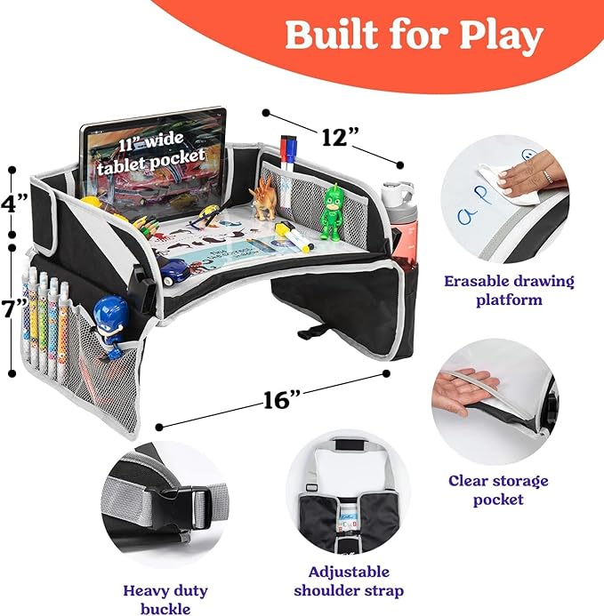 - 【Mess-Free & Multipurpose Entertainment Gear】- Designed with a 15.5in wide x 12in deep erasable drawing platform that doubles as a food tray, so kids won't have to switch places when they get hungry. This car seat tray has a water bottle holder to keep your child's beverage in easy-reach access. It has a 1.5in wide adjustable carrying strap with a shoulder pad for a comfortable and strain-free carry. Its extra high side walls are made ideal for kids, measuring 12in in length and 4in in height.