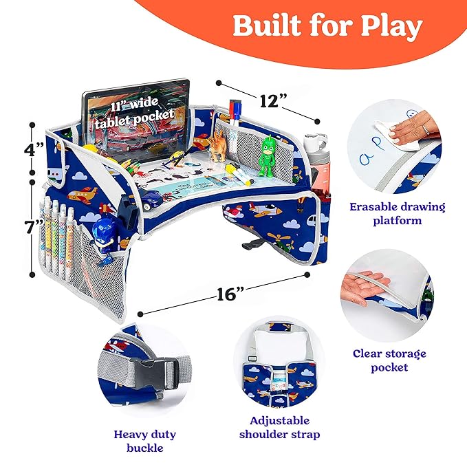 - 【Mess-Free & Multipurpose Entertainment Gear】- Designed with a 15.5in wide x 12in deep erasable drawing platform that doubles as a food tray, so kids won't have to switch places when they get hungry. This car seat tray has a water bottle holder to keep your child's beverage in easy-reach access. It has a 1.5in wide adjustable carrying strap with a shoulder pad for a comfortable and strain-free carry. Its extra high side walls are made ideal for kids, measuring 12in in length and 4in in height.