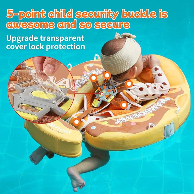 - Full protection: this non-inflatable baby swimming float has child security lock, safety and easy use. The Infant pool float has buoyancy tail, avoid flipping over and for feet rest. Detachable and adjustable UPF50+ sun canopy, keep baby's skin away from sun