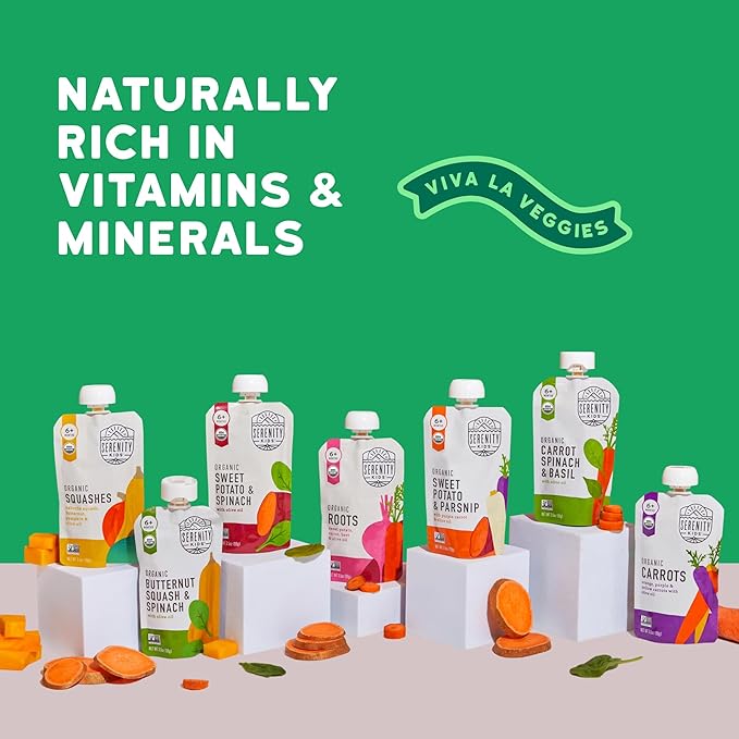 - Savory Veggie Variety: Dive into the goodness of Serenity Kids Organic Veggie Puree Pouches—your partner in fall baby meals for your little foodie in training. Packed with nutrient-dense veggies, these baby puree pouches are perfect for 6+ months and beyond