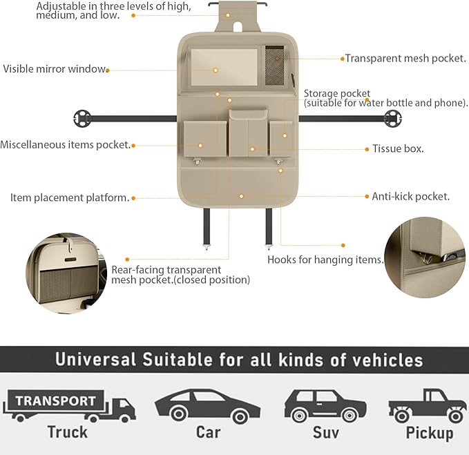 - ✔Stability and Easy Installation:Offers three different height settings, providing flexibility for various items and space requirements.This backseat organizer installation is pretty easy.It was designed for hassle free installation without the requirement of any tools.We have improved the adjustable buckle strap, plum buckles, aluminum hook plus strong straps ensures the great stability of the car seat storage organizer.