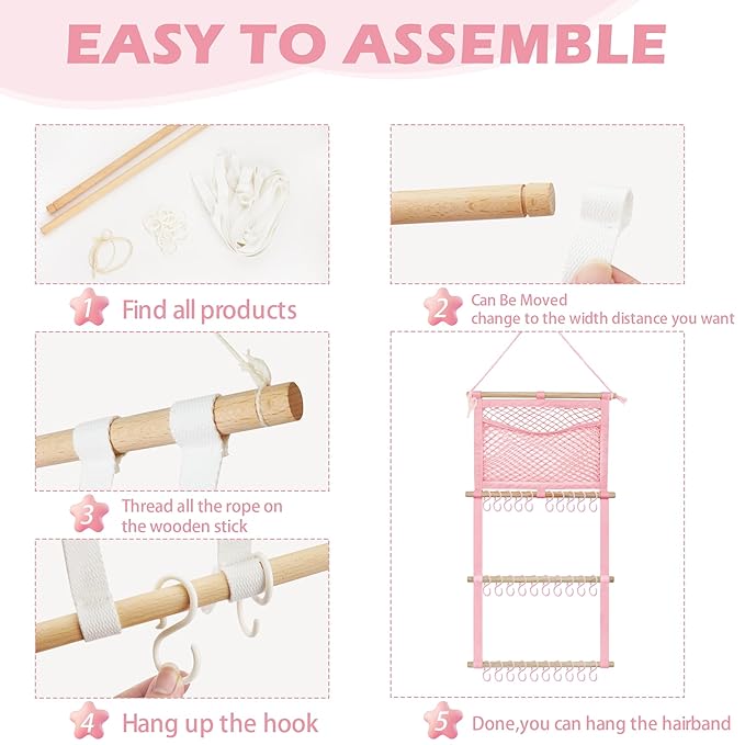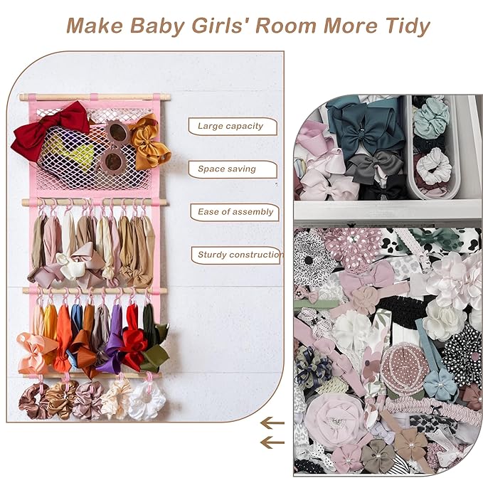 - 【HIGH QUALITY MATERIAL】- The hook of baby headbands and bows holder is an upgraded version to prevent detachment and better help you store baby headbands. The net pocket and belt are made of high-quality cotton canvas belt, with good load-bearing capacity. The wooden stick is very smooth, sturdy, and not easy to deform and crack, making it more durable.