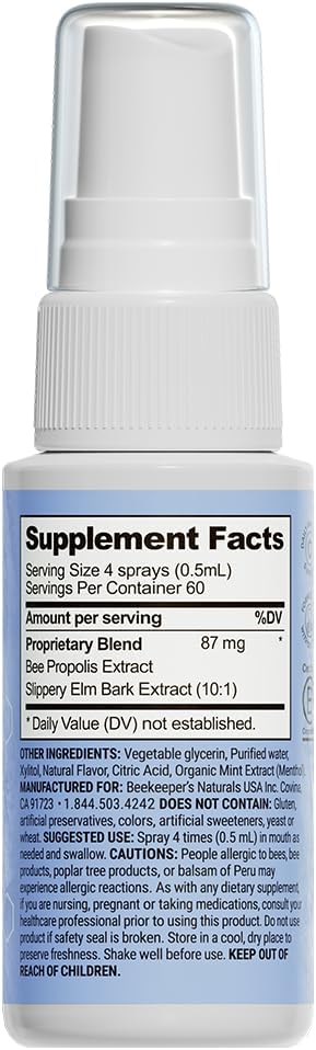Propolis Throat Soother by Beekeeper's Naturals – Maximum Throat Relief w/ Menthol, Slippery Elm, Bee Propolis Extract – Fast-acting & Cooling Comfort (1.0 oz)(Pack of 1)