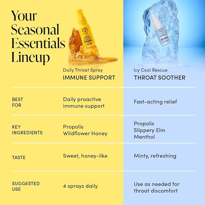 - IMMEDIATE COOLING COMFORT FOR YOUR THROAT: When your throat feels dry, scratchy, or overworked, reach for a fast-acting icy blast of comfort. This powerful blend of bee propolis, slippery elm bark, and menthol is designed for maximum throat relief and delivers refreshing comfort, so you can keep going