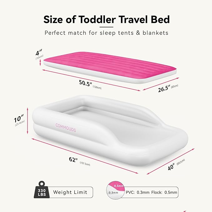 - Upgraded Materials for Long-Lasting Comfort: Made of 0.3mm PVC and topped with 0.5mm high-density flocked surface, the toddler travel bed provides a soft, cozy, and supportive surface for baby sleep. Comfortable, Puncture-resistant and built to last, makes it ideal for babies kids
