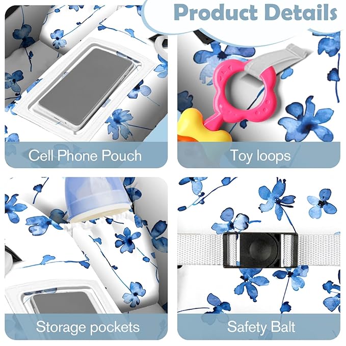 - đ¶ăFULL OF FEATURES AND BENEFITSă:Extra thick padding for added comfort. Multiple pouches for personal and baby accessories storage. Machine washable. Mobile phone transparent pocket for your kid entertainment. Infants teether. Toy loop to hook up your baby's favorite toy. Sippy cup / bottle strap. Adjustable safety harness.