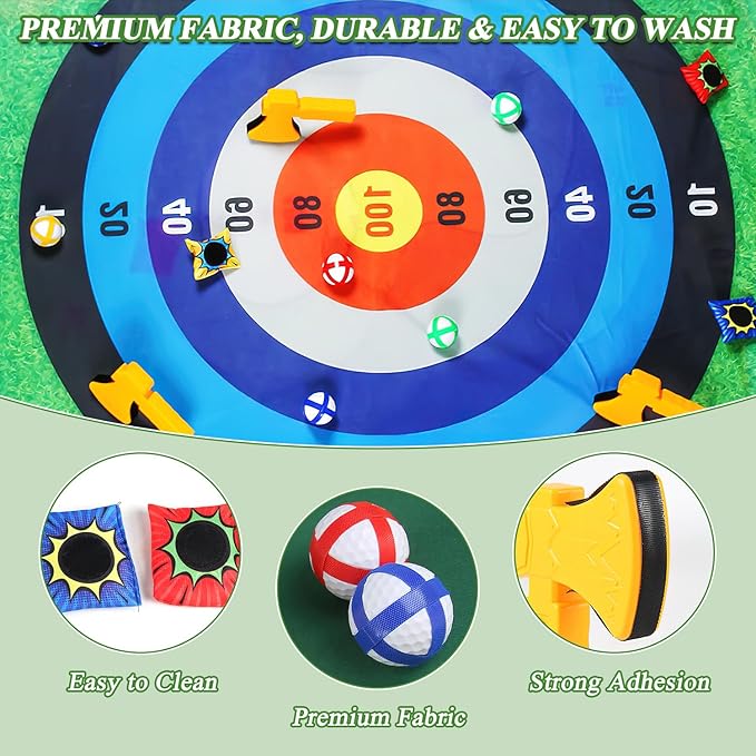 - Sticky Golf Game Set - This golf chipping practice mat comes with stand, 12 sticky balls, 6 axes, 2 soccer balls and 8 bean bags, 4 ground stakes, 1 golf club, 1 carrying bag, 1 chipping mat, great 4 in 1 backyard game set for indoor practice, backyard competition or beach golf challenges