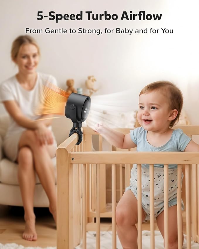 - 5 Speeds & Comfortable Airflow: This portable stroller fan uses turbo technology to deliver a strong breeze and beat intense heat. Levels 1–2 provide quiet cooling indoors, while Levels 3–5 offer powerful cooling for scorching outdoors, keeping your baby cool whether resting or playing. Two separate buttons let you easily adjust speed without cycling through all settings