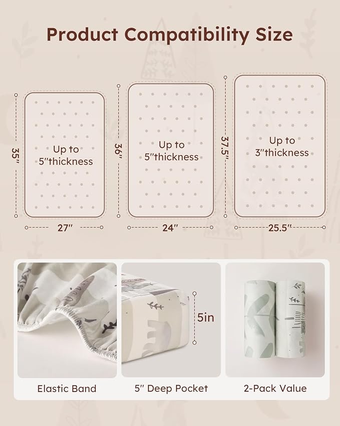 - Snug Fit and Secure: Measuring 38"x26", Yoofoss mini crib sheets are designed to snugly fit most Pack n Play or potable playard mattress.The 3–5 inch deep pocket provides full coverage that wraps around the mattress to keep the sheet neatly in place, ensuring a safe and comfortable sleep for your baby.