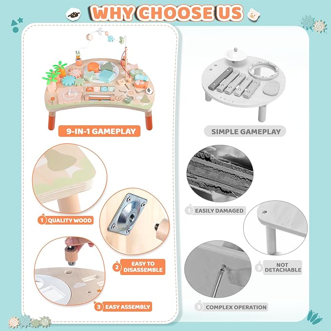 - 9‑in‑1 Montessori Sensory Activity Table: Engage your toddler with nine interactive learning stations in one sturdy wooden table—bead maze, magnetic fishing, teach‑time clock, spinning gears, shape sorter, animal maze, carrot harvest, rotating blocks, and rattle roller—for endless hands‑on fun and discovery