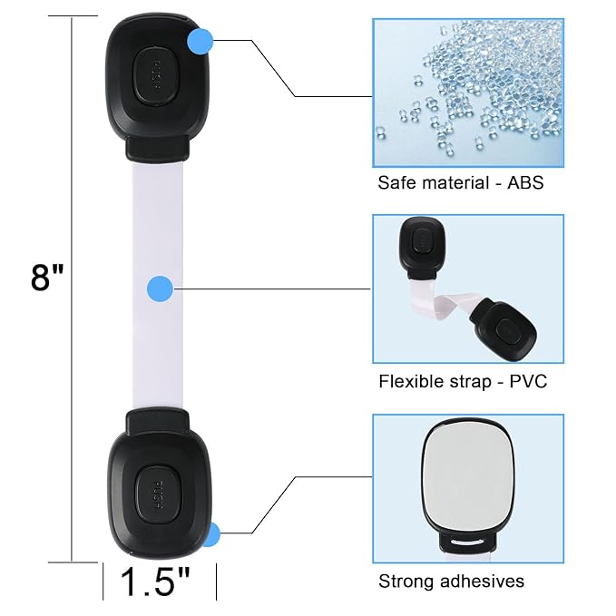 - Easy to Install Baby Safety Cabinet Locks: Strong adhesive industrial-grade tape on both sides of the child safety cabinet lock, No drilling screw or any special tools needed! so you can install and remove them within seconds, causing no damage, mar or remaining any marks on your furniture. and child safety strap locks are easy to use for adults but nearly impossible for a child to figure out - even if they can, they lack the finger strength to depress the buttons easily