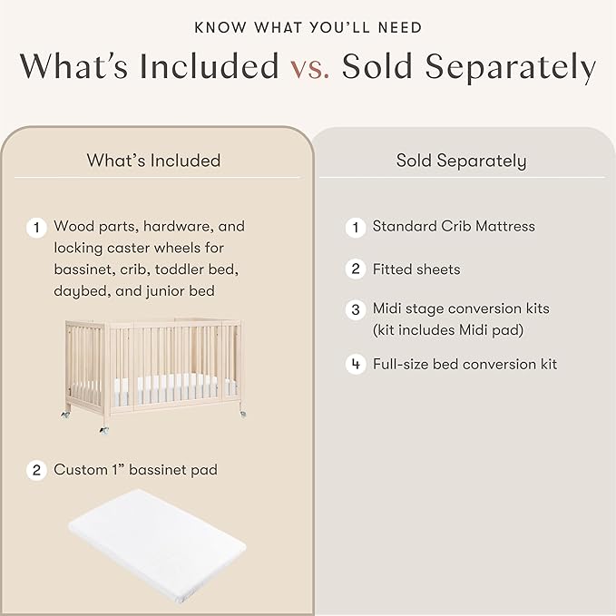 - Includes Conversion Kits & Pad: Comes with hardware & conversion kits to convert from bassinet, standard crib, toddler bed, daybed & junior bed, and a 1” bassinet pad. Optional 4 additional conversion kits for 3 midi crib stages (#M30879) and 1 full-size bed (#M5789) are sold separately.