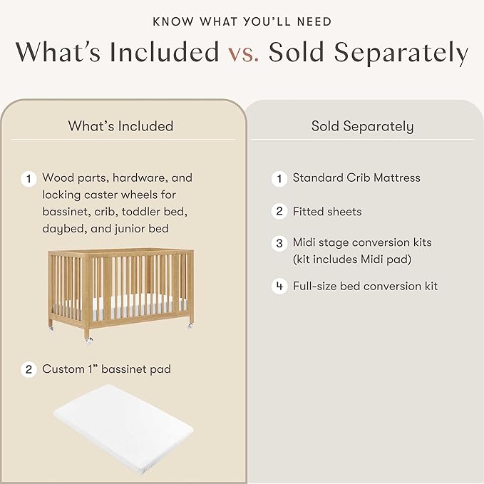 - Includes Conversion Kits & Pad: Comes with hardware & conversion kits to convert from bassinet, standard crib, toddler bed, daybed & junior bed, and a 1” bassinet pad. Optional 4 additional conversion kits for 3 midi crib stages (#M30879) and 1 full-size bed (#M5789) are sold separately.