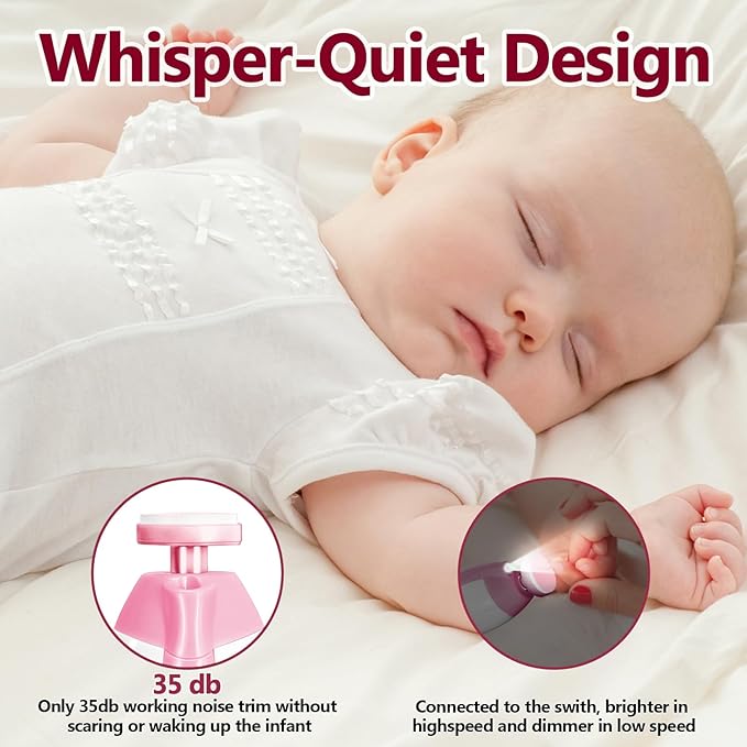 - Low Noise – The Baby electric nail trimmer is equipped with a whisper-quiet design. Only 35dB operating sound. You can file nails even as the baby sleeps, without causing any disturbance. You can use it in the dark at night.
