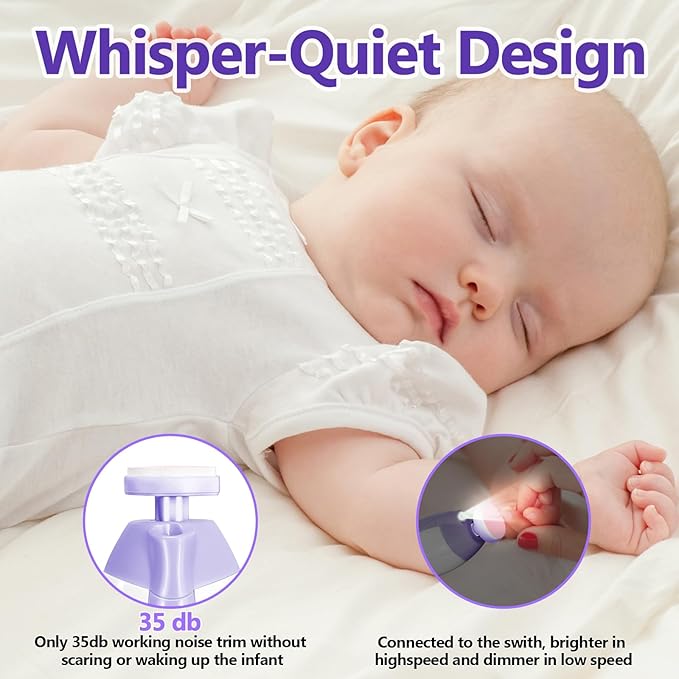 - Low Noise – The Baby electric nail trimmer is equipped with a whisper-quiet design. Only 35dB operating sound. You can file nails even as the baby sleeps, without causing any disturbance. You can use it in the dark at night.