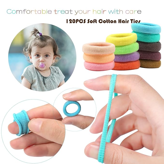 - Multicolour & Perfect Fits - Package included 120pieces,12 colors cotton hair bands are super stretchable with high quality elastic,perfect mini size for babies,toddlers and little girls for daily use,Also can match for most colors of your kids' clothes