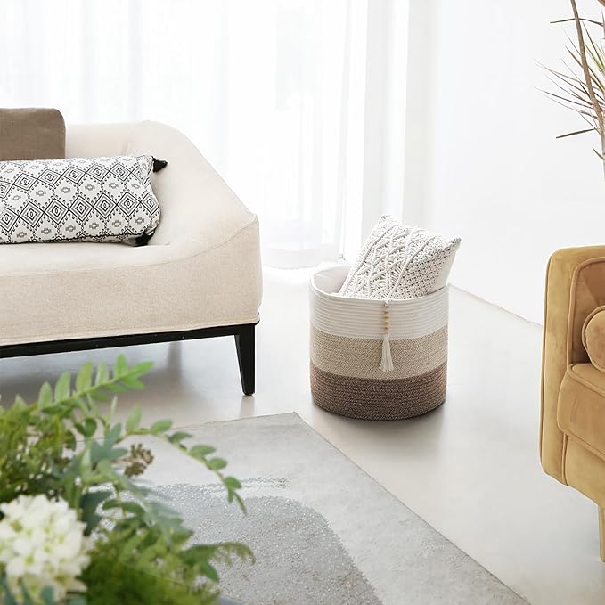 Mkono Woven Storage Basket Decorative Natural Rope Basket Wooden Bead Decoration for Blankets,Toys,Clothes,Shoes,Plant Organizer Bin with Handles Living Room Home Decor, 16"W × 13.8"L