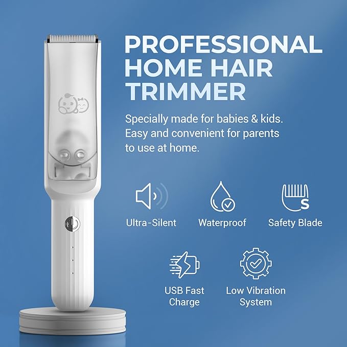 - Fully Waterproof: The trimmer is 100% washable and can be rinsed directly under water after use for easy cleaning. The rust-resistant ceramic blade adds extra durability. Quiet Motor & Vacuum: Designed for a peaceful grooming experience, the motor and vacuum system operate with low noise and minimal vibrations, gentle enough not to startle your baby.