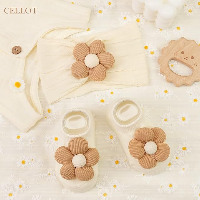CÉLLOT Baby Girl Headband and Socks, Non-Slip Floral Socks and Soft Floral Nylon Hairbands for Babies Infants and Toddlers