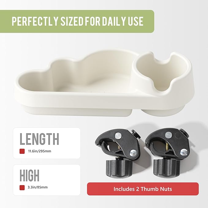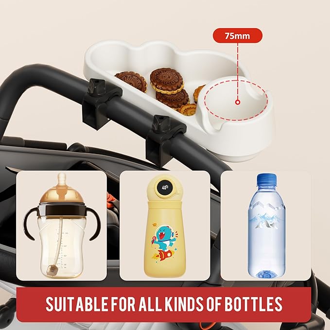 - Eating Conveniently: This stroller snack tray is ergonomically designed, includes a snack bowl layer and a child cup holder with handle, the cup holder can accommodate most baby bottles, sippy cups and drinks, whether you are walking, shopping or playing in the park, it is convenient to take your baby's food and drinks, it is a good helper for baby strollers