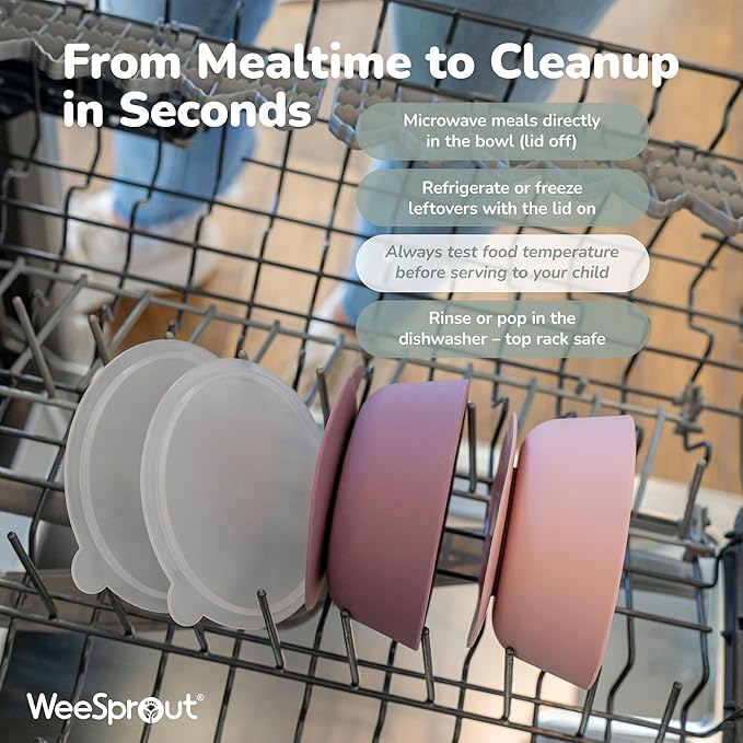 - ✅ DISHWASHER, MICROWAVE, & FREEZER SAFE SUCTION BOWLS FOR BABIES: Serve food, freeze and heat leftovers, then toss your infant feeding set in the dishwasher. No more dirtying multiple dishes for one meal! Your silicone baby food bowls are 100% dishwasher, microwave, and freezer safe. (*Remove lids before microwaving)