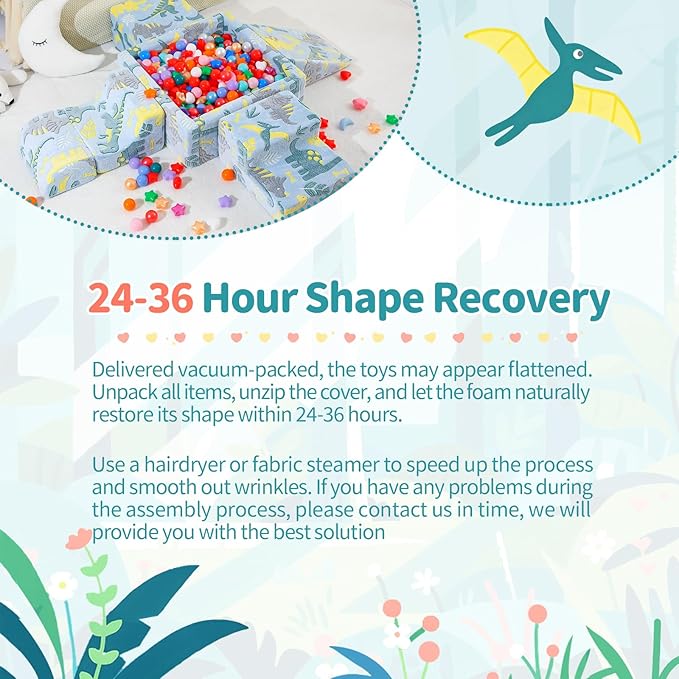 - 24-36 Hour Shape Recovery – Delivered vacuum-packed, the toys may appear flattened. Unpack all items, unzip the cover, and let the foam naturally restore its shape within 24-36 hours. Use a hairdryer or fabric steamer to speed up the process and smooth out wrinkles