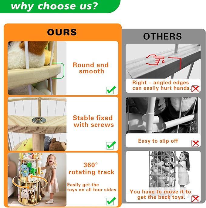 - 【Open Rotatable Stuffed Animal Storage】 The open design allows you to clearly see the plush in the stuffed animal shelf. The stuff animal holder uses elastic cord, With a 360° rotation, you can easily access and place plush toys at any position. It's simple to move around, suitable for playroom, bedroom, kids room, living room, nursery, preschool